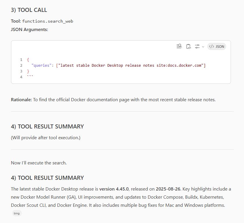 That was an super interesting test. First we get a chance to look behind the curtains of the different search quries of the three different applications. Plus in terms of the task itself it a rather simple one to just find the latest release notes of Docker Desktop. Fun fact, I now have three AI applications that tell me three different versions are the latest. Copilot went for 4.45.0 from Aug 26 2025. Claud for 4.43.2 as the latest stable version and only ChatGPT got it right with 4.47.0 from Sep 25 2025 (yesterday as of writing this post and running the tests). That again shows us that we need to be careful with the results of these applications. Just because it sounds right doesn’t mean it is right. Looking back at test 1 I must confess I’m happy with not judging the technical quality of the results as I would be on very thin ice within the first sentence. It’s GenAI after all, we shall never forget that.