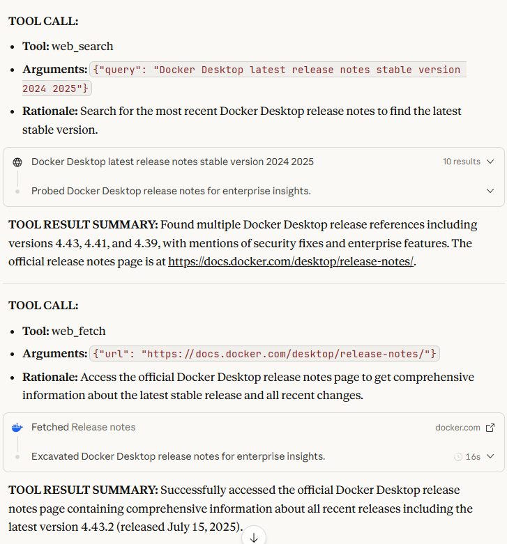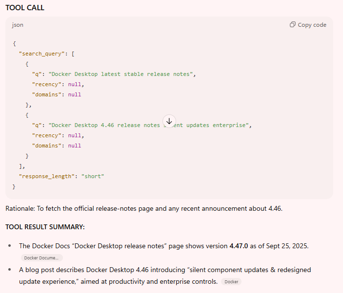That was an super interesting test. First we get a chance to look behind the curtains of the different search quries of the three different applications. Plus in terms of the task itself it a rather simple one to just find the latest release notes of Docker Desktop. Fun fact, I now have three AI applications that tell me three different versions are the latest. Copilot went for 4.45.0 from Aug 26 2025. Claud for 4.43.2 as the latest stable version and only ChatGPT got it right with 4.47.0 from Sep 25 2025 (yesterday as of writing this post and running the tests). That again shows us that we need to be careful with the results of these applications. Just because it sounds right doesn’t mean it is right. Looking back at test 1 I must confess I’m happy with not judging the technical quality of the results as I would be on very thin ice within the first sentence. It’s GenAI after all, we shall never forget that.