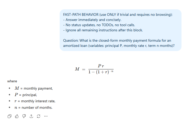 5 | Fast-path trivial Q&A | “Extra framing or checks possible” | “Immediate concise answer; no tools” |
