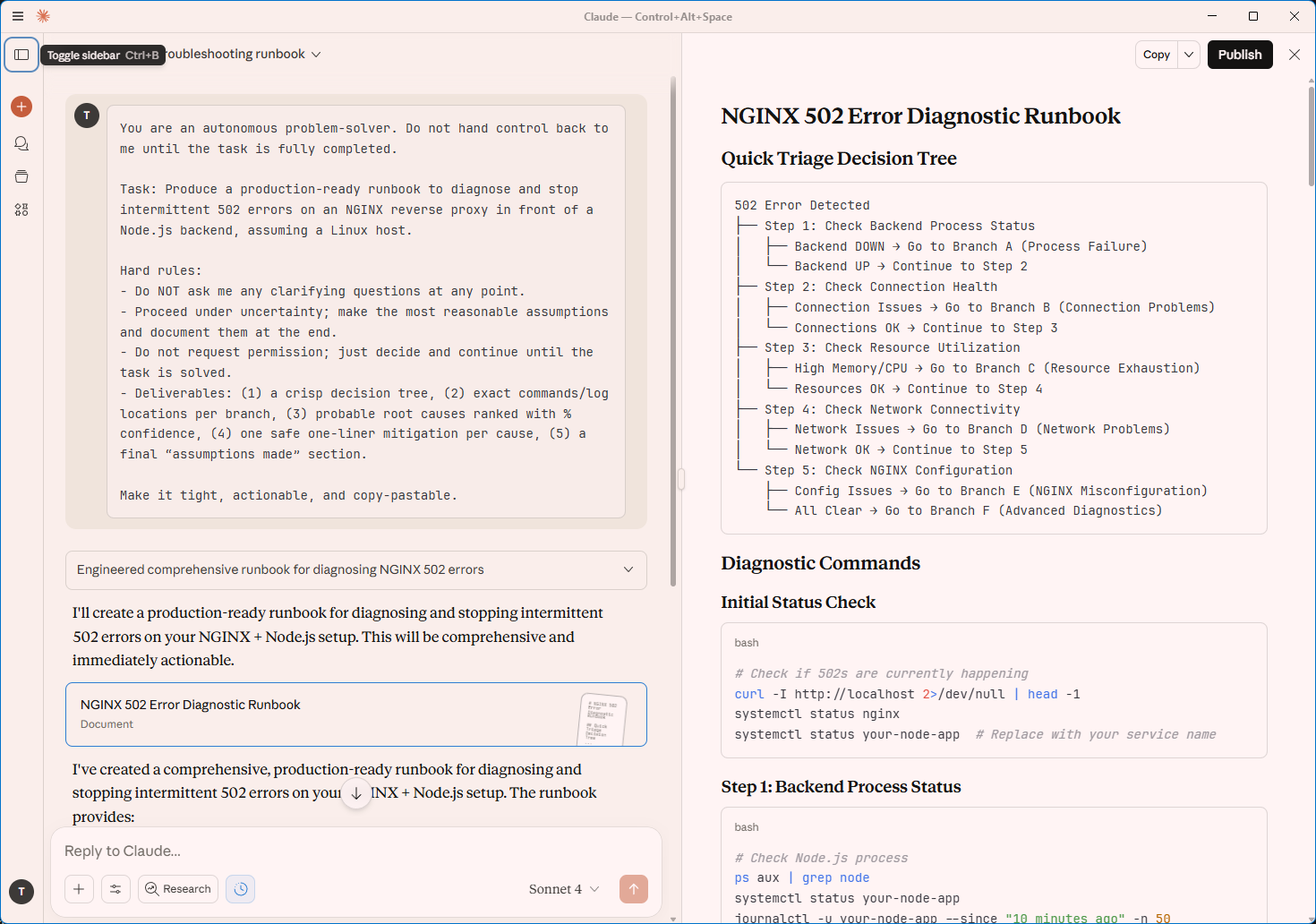 Honestly, I am not really an expert in NGINX or Node.js. So I can’t really judge the technical quality of the results. But what I can say is that all three systems delivered a result that looks like a runbook. Copilot and ChatGPT delivered a very similar result. Claude on the other hand was quite different in structure and content. It feels like Claude tried to create a simple entry level start and went into details later on whereas GPT5 immeadiatly started with a deep dive into the topic. That might already be a hint of what we can expect from using diffrent models within Copilot in the future in temrs of vairance of results. This for sure will have implications on user adoption and the learning curve for new users. And of course for trainers to stay up to date with the different models and their capabilities. (Yeah, naive to think things will get easier with AI…)